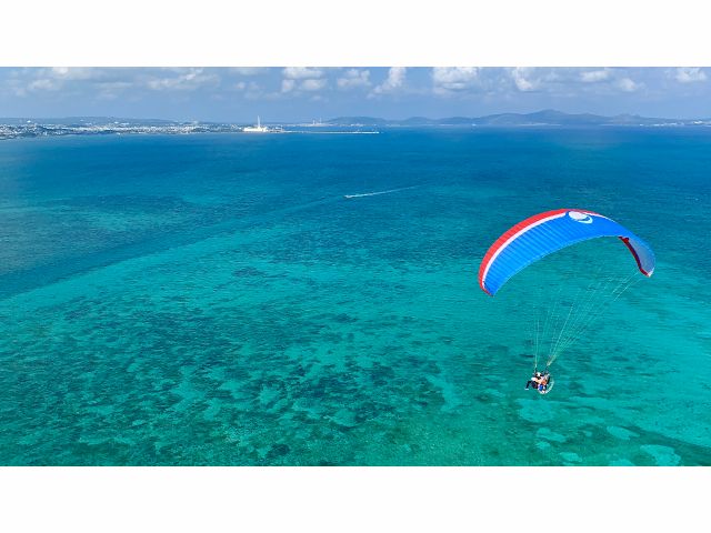 空から沖縄の美しい景色を堪能できるのが、モーターパラグライダーです。