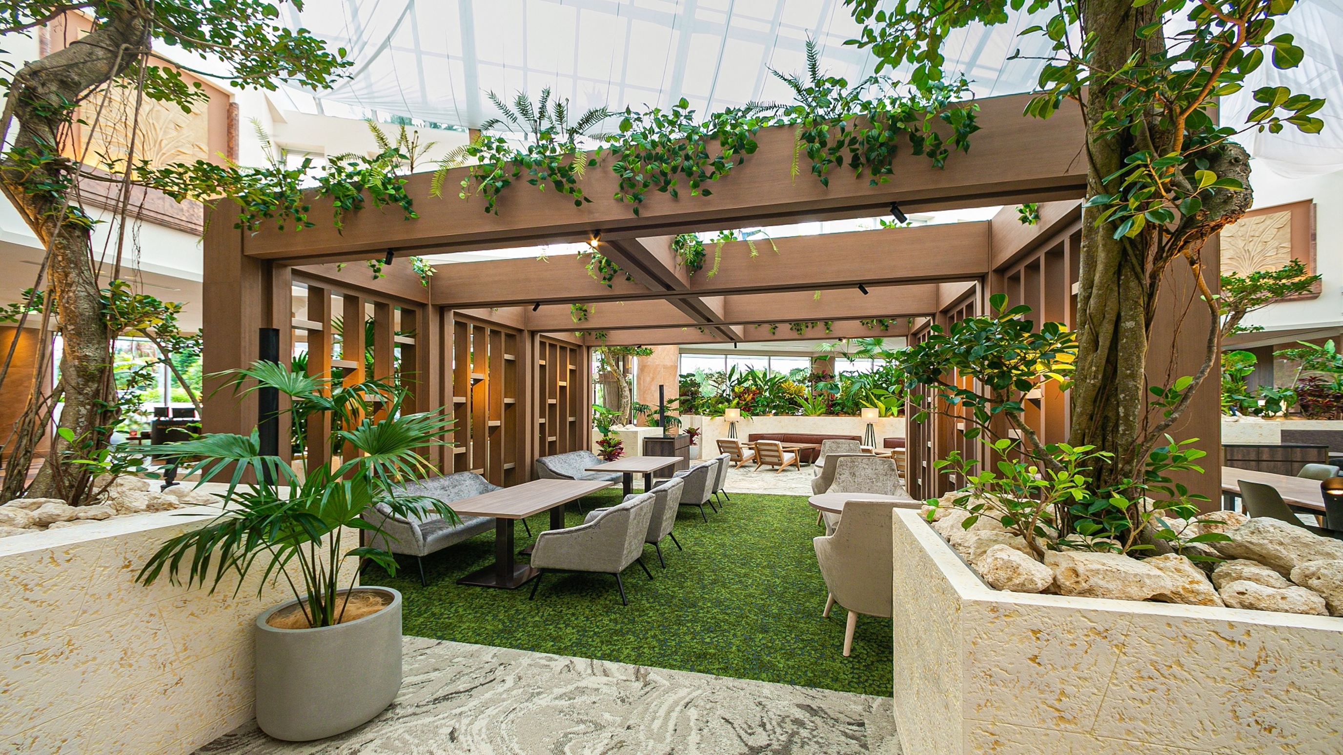 木漏れ日が降り注ぎ、やんばるの森に自生する植物をふんだんに配置した緑溢れるロビーエリアでは、ホテルのコンセプトである「島とあそぶ 森とつながる」をイメージした環境音楽が流れ、やんばるの夜の森に佇んでいるような没入感と、日常から切り離された開放感が交差する空間を演出しています。